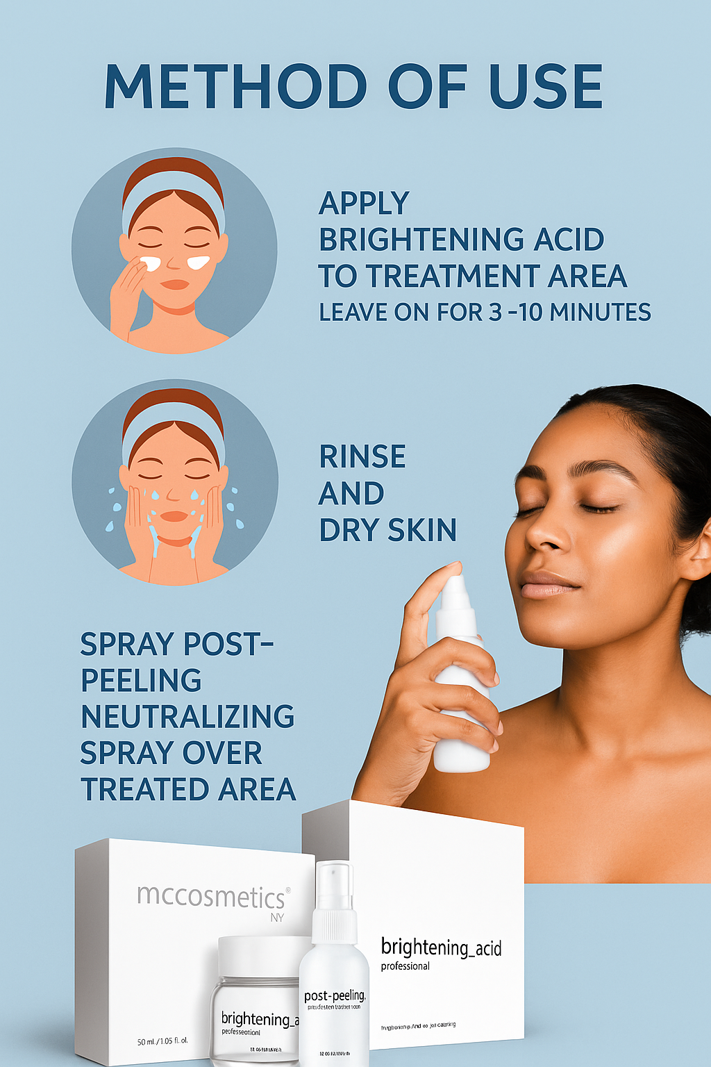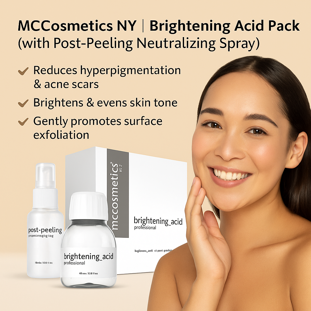 Regular price $ 134.55MCCosmetics NY Brightening Acid Pack is a professional-use cosmetic peel formulated to help improve the appearance of uneven skin tone, discoloration, and dullness. Combining Arbutin, Lactic Acid, Citric Acid, Kojic Acid, and Salicylic Acid, it gently supports surface renewal for a smoother, brighter, and more radiant-looking complexion. The included post-peeling neutralizing spray helps restore comfort and balance after treatment, making it suitable for all skin types under professional supervision.