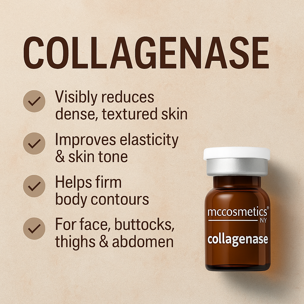 Regular price $ 272.00MCCosmetics NY Collagenase is a professional-use cosmetic solution formulated with Collagenase G and Mannitol to help improve skin tone and texture. This advanced formula supports the skin’s natural renewal process, promoting smoother, firmer, and more radiant-looking skin while enhancing hydration and comfort for a luminous, revitalized appearance.